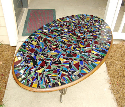 Below is a picture of the table I am working on. I get stained glass scraps and broken glass and break them with a hammer to shape them closer to how I want them. I also put silver leaf on the backs of a lot to add a metallic shine and to lighten up the color. That takes a long time. Then. I arrange them, kind of like putting a puzzle together and glue them down and then after that, do the grout. It's got a way to go until it will match the previous one I made, which is below this.