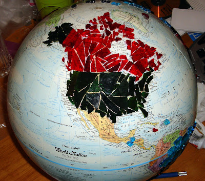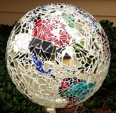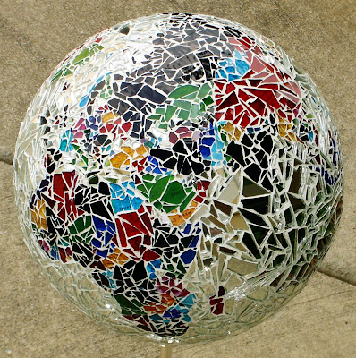 I really liked it the best before it was finished, but now wish I had not done the ocean area with mirror. It reflects too much and takes away from the colors of the stained glass. I don't like the white grout either, so I might try staining that. It has become a very heavy globe. That's a lot of glass on there!