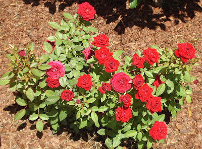 Our little rose bush is looking pretty amazing right now. We just planted these about a month and a half ago. We gave them some rose food and then watered them a lot and they have almost tripled in size in the this short amount of time. I've counted at least 28 flowers on them right now. It's pretty neat. Especially since when we got them they only had about 4 blooms on them and were only about 6 inches tall. This isn't the best picture because it was so sunny out when I took it and the color didn't turn out quite accurately. They are actually more of a deep, blue-tone red.